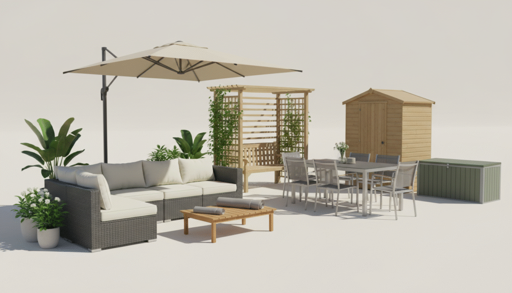 Key features include durable timber, powder-coated metal, protective finishes, rot resistance, and low maintenance. Variations include single- and multi-piece dining sets, modular seating, arbors, gazebos, and protective covers. When buying, consider space, climate, sun exposure, storage needs, and whether you want built-in planters or plant supports.